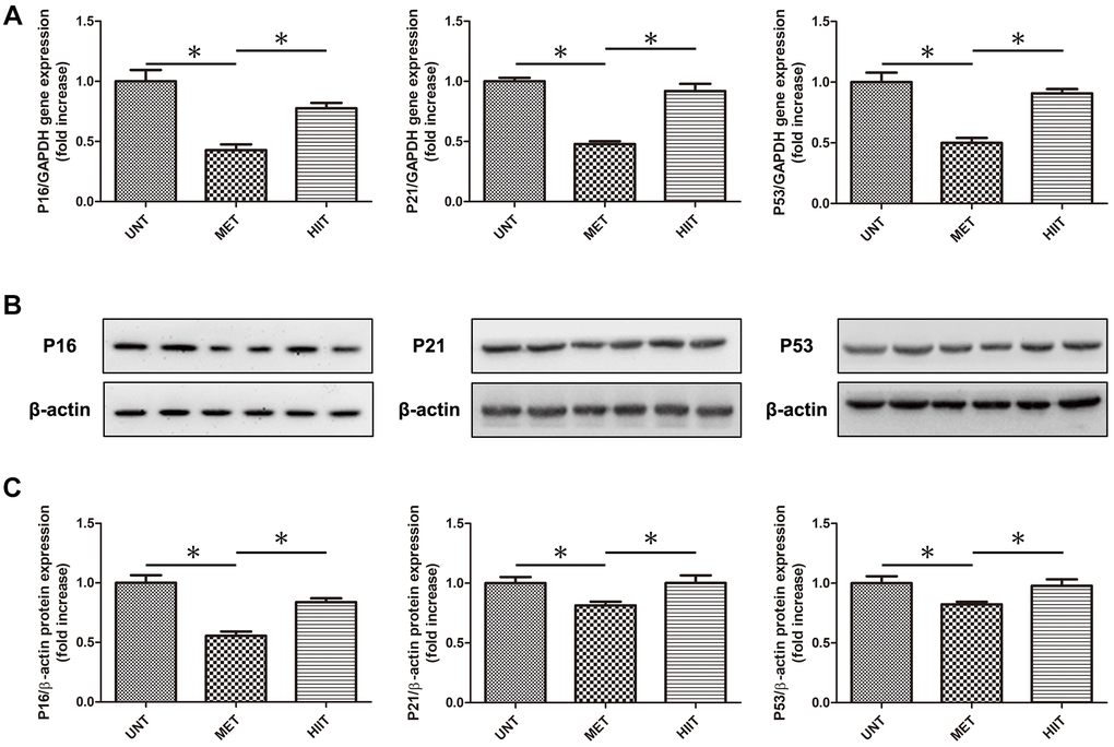 We evaluated the levels of natural aging markers by real-time PCR and western blotting (Figure 5A–5C). The expression of P16, P21 and P53 significantly increased in the UNT group, and it was attenuated by MET.