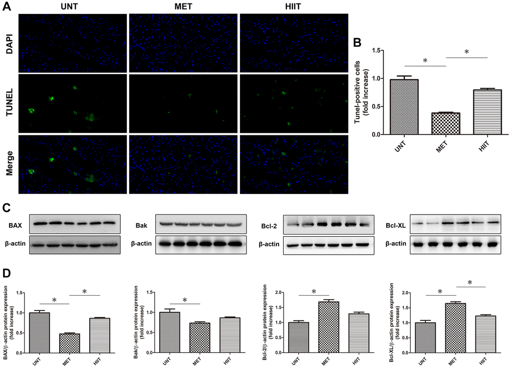 The number of TUNEL-positive cells increased in the heart of UNT mice compared with that in the heart of MET mice, whereas cardiac apoptosis was reduced in MET mice (Figure 6A–6B). Immunoblotting (Figure 6C–6D) showed that in the UNT group, the expression of the pro-apoptotic proteins BAX and Bak increased and that of Bcl-2 and Bcl-XL decreased. MET treatment reduced the BAX and Bak levels and enhanced the expression of Bcl-2 and Bcl-XL. These results indicate that MET has a beneficial effect on the heart tissue in aging mice.