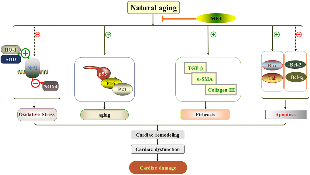 In this study, we demonstrated in male C57BL/6J mice that 24-week exposure to MET, but not HIIT, reduced the cardiac damage associated with the natural aging process. Further analysis demonstrated that cardiac dysfunction associated with aging was due to the acceleration of myocardial remodeling, myocardial fibrosis, oxidative stress, and apoptosis. Importantly, the MET regimen prevented cardiac dysfunction and reduced cardiac damage. These findings are summarized in Figure 7. However, HIIT had no such effects.