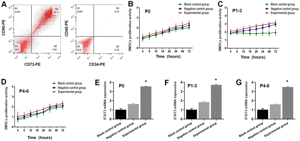 The BMSCs proliferative function at P0, P1-3, P4-6 in the experimental group, the group of negative control, and blank control group was investigated at 72, 48, 24, 20, 16, 12, 8, and 4 hours as time nodes prior to transplantation. As evident from Figure 1B–1D, the results demonstrated no significant difference with regards to the total count of viable cells in all the three groups at the time point (P>0.05), thereby implying that the proliferation of BMSCs is not affected by lentivirus transfection. It can be seen in Figures 1E–1G that the mRNA expressions of STAT3 in the experimental group rose significantly in comparison to the negative control and blank control groups (P<0.05), indicating that the transfection of plasmid with STAT3 overexpression was effective.