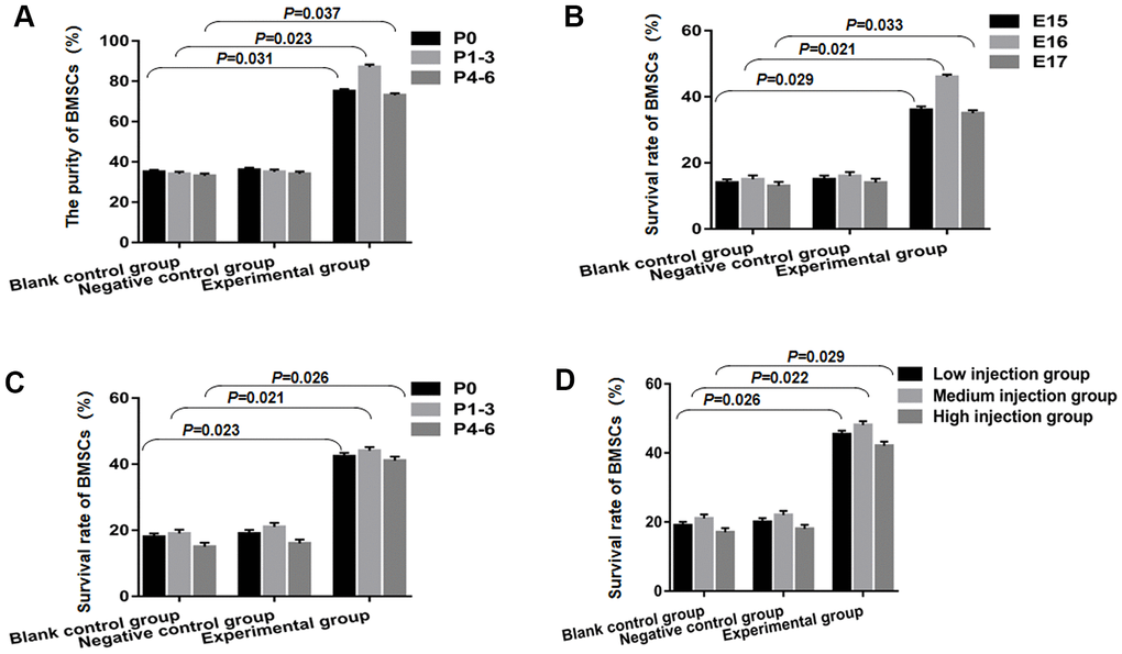 The purity of BMSCs, prior to transplantation was found to be enriched from 33±1.22% from P4 to P6, 34±1.16% at P1-3, and 35±1.02% at P0 in the blank control group. It was observed to be 36±0.98% at P0, 35±0.87% at P1-3, and 34±0.71% from P4 to P6 in the group of negative control. However, the purity of BMSCs enriched from 73±1.07% at P4 to P6, 87±1.29% from P1 to P3, and 75±1.13% from P0 among BMSCs combining with STAT3 overexpression plasmid transfection. CD90 and CD73 expression was also tested at these time points and were found to be statistically significant (P<0.05, in comparison to negative control and blank control groups, accordingly) as shown in Figure 2A. The purity of the P1-3 BMSCs coupled with STAT3 overexpression plasmid transfection was found to be higher than that of the P0 and P4-6 BMSCs. Then, on E15, E16, and E17, P1-3 BMSCs were transplanted into individual groups of rat fetuses to see if the transfection of plasmid with STAT3 overexpression affects the ratio of the survival of cells.