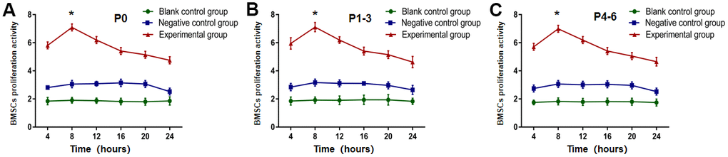 The proliferative performance of P0-6 BMSCs in the experimental group, negative control group, and blank control group was discovered at 4, 8, 12, 16, 20, and 24 hours, by testing the living cells for their OD value. As shown in Figure 3A–3C, the results showed that the experimental group's OD value peaked at eight hours after E16 transplantation on E19, then progressively declined, and was substantially differing from the blank control and negative control groups (P<0.05). The OD peak timing and value among the negative control and blank control, however, were not significantly different.
