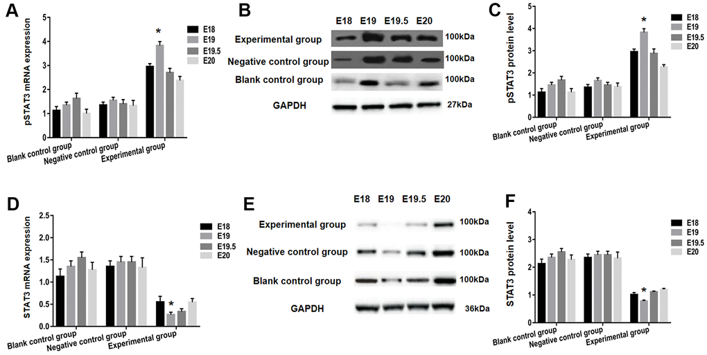 On E18, E19, E19.5, and E20, the experimental group's developmental changes in the expression of pSTAT3 following the transplantation of P1-3 BMSCs were substantially differing from the negative control and blank control groups, and were particularly notable at embryonic day 19 (E19). From E18 to E20, the experimental group's pSTAT3 mRNA and protein levels rose substantially, with E19 being the highest (Figure 4A–4C). In the experimental group, between E18 and E19, the expressions of STAT3 mRNA and the levels of the protein steadily declined with embryo development, with the lowest being on E19. The levels of STAT3 and pSTAT3 mRNA and protein in the groups of negative control and blank control remained stable from E18 to E20, which is statistically lower in comparison to the experimental group (P< 0.05) as illustrated in Figure 4D–4F.