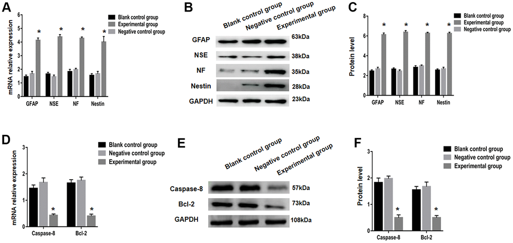 When P1-3 BMSCs were transplanted on E16, the relative expression of GFAP mRNA was considerably different in all three studied groups, namely the experimental, negative control, and blank control. On E19 transplanted fetuses, the levels of GFAP mRNA in the experimental group were substantially greater in comparison to negative control and blank control group (P<0.05). Parallelly, the comparative expressions of NF, NSE, and nestin mRNA in individual groups were essentially the same as GFAP (Figure 5A). Furthermore, Western Blot protein expression of NF, NSE, GFAP, and nestin was similar to real-time PCR (Figure 5B, 5C).