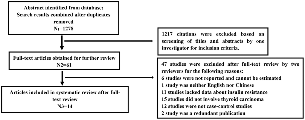 1278 relevant articles were collected after preliminary screening. Sixty-one articles were selected for full-text review after screening the abstract. Finally, 14 articles were included in this study. Figure 1 showed the details of systematic search process. Of these included 14 studies, three are published in Chinese [10, 11, 17] and the rest are all published in English [5–9, 13–16, 18, 19]. Four studies were conducted in Turkey and three in China. The rest countries including Italy, Argentina, Nepal, Korea and Iran, each has one study. Totally, there are 2024 patients with thyroid carcinoma in case group, and 1460 persons in control group which including healthy controls and patients with benign thyroid diseases. The sample size in case group ranges from 20 to 735 while 20 to 537 in control group. Patients in case group were diagnosed with histopathological. Among which, five studies reported the relationship between insulin resistance and PTC, and the rest seven reported the DTC. Table 1 summarized the detailed characteristics of these 14 studies.