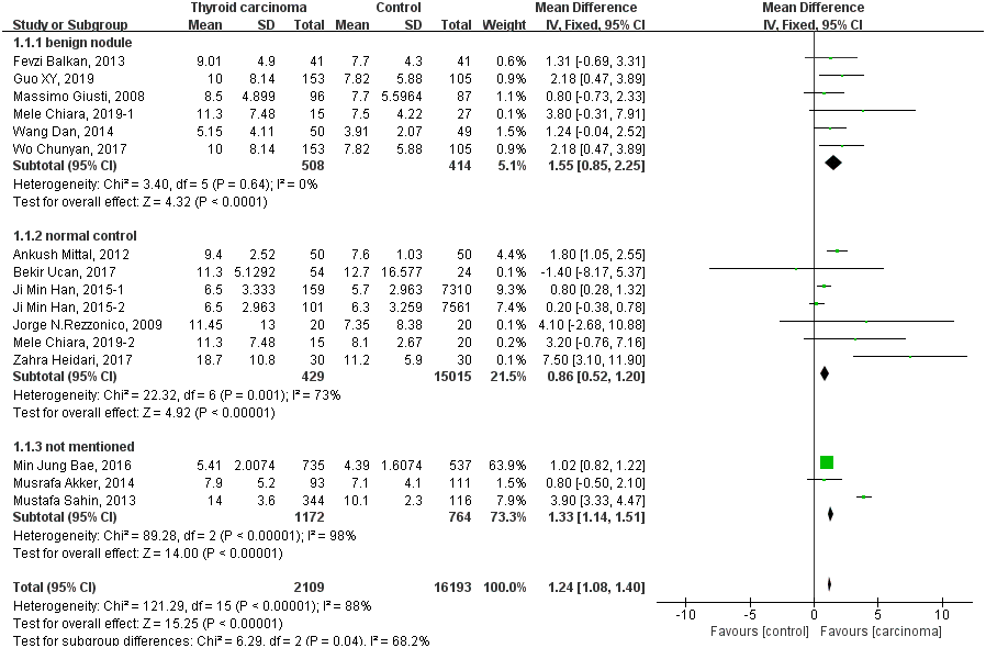 Thirteen studies reported the level of fasting serum insulin [5–9, 11, 13–19]. Fixed-effect model was used to merge the WMD and pooled effect size is 1.24 (95% CI 1.08 to 1.40, P<0.00001), which showed that thyroid carcinoma patients have a higher level of fasting serum insulin than controls. Subgroup analysis with fixed-effect model was done by the different original of control participants that including benign nodule diseases, normal control and not mentioned. All the three subgroups show a significantly higher level of fasting serum insulin in the group of thyroid carcinoma (Figure 2). The pooled WMD in subgroup of benign nodule diseases is 1.55 (95% CI 0.85 to 2.25, P<0.0001) and no significant heterogeneity was detected (heterozygosity test, Chi2=3.4, P=0.64, I2= 0%). The pooled WMD values is 0.86 in subgroup of normal control (95%CI 0.52 to 1.20), whereas, a high heterogeneity was calculated (heterozygosity test, Chi2=22.32, P=0.001, I2= 73%). In conclusion, the level of fasting serum insulin in thyroid carcinoma patients is statistically significant increased compared to persons without thyroid carcinoma.
