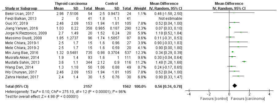 Thirteen studies analyze the relationship between HOMA-IR and thyroid carcinoma [5, 7–11, 13–19]. Random-effect model was used to estimate pooled WMD. The pooled WMD is 0.56 (95% CI 0.34 to 0.78, P<0.00001), whereas heterogeneity was detected between included studies (heterozygosity test, Chi2=275.10, P<0.00001, I2= 96%) and the results showed in Figure 3. That means a higher HOMA-IR is related to a high incidence of thyroid carcinoma.
