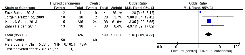 Four studies reported the association of insulin resistance with the risk of thyroid carcinoma [5, 7, 9, 15]. Fixed-effect model was used to estimate pooled OR. The pooled OR is 3.16 (95% CI 2.09 to 4.77, P<0.0001) and showed in Figure 4. Whereas, a heterogeneity was detected between these four studies (heterozygosity test, Chi2=5.23, P=0.16, I2= 43%). In sum, insulin resistance increase the risk of thyroid carcinoma 216% compared with participants without insulin resistance.