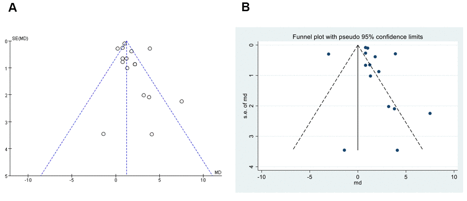 Funnel plot, a method for qualitative evaluation of publication bias, was done in this meta-analysis. All the studies are symmetry distributed at the top of the funnel plot made with review manage by visual observation (Figure 5A). We use stata16.0 software to detect publication bias, as shown in Figure 5B, the results show that there is no publication bias (Egger`s test P=0.565). According to the results showed above, there was no obvious publication bias in the included studies.