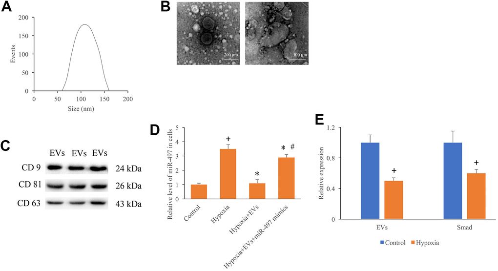 The size distribution, scanning electron microscopy images, and surface markers of isolated EVs were investigated. The average diameter peak at 110 nm in DLS was observed (Figure 1A). The homogeneous and spheroidal vesicles of EVs could observed through scanning electron microscopy images (Figure 1B). In addition, the specific markers of EVs, CD9, CD81, and CD63, were identified (Figure 1C). Meanwhile, after establishment of hypoxia cell model, the expression of miR-497 was measured. The mRNA level of miR-497 was remarkably increased after hypoxia treatment, but miR-497 was significantly suppressed after EVs treatment (Figure 1D). In addition, the levels of EVs and Smad7 were significantly suppressed after hypoxia treatment (Figure 1E).