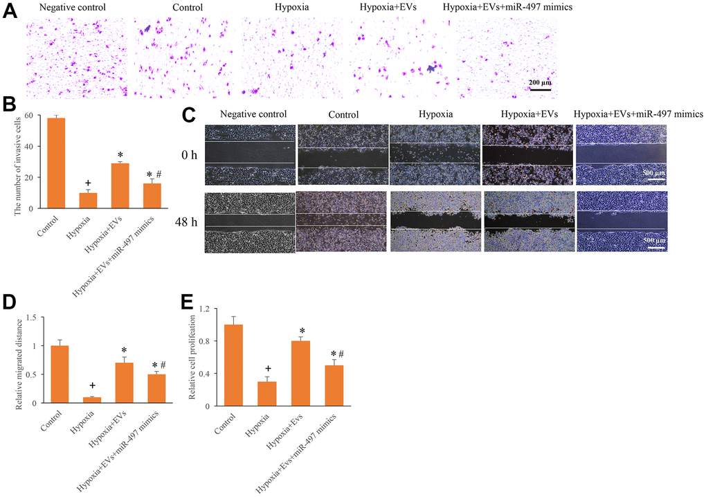 To investigate the role of EVs and miR-497 on the cell migration, invasion, and proliferation, the hypoxia cell model was established. After hypoxia administration, cell migration, invasion, and proliferation were markedly inhibited (Figure 2A–2E). However, the EVs treatment remarkably increased the cell migration, invasion, and proliferation ability after hypoxia treatment. In addition, simultaneous with miR-497 mimics and EVs significantly reversed the influence of EVs, and overexpression of miR-497 significantly suppressed the cell migration, invasion, and proliferation ability (Figure 2A–2E). Therefore, EVs and miR-497 might be involved in the regulation cell viability in the hypoxia cell model.