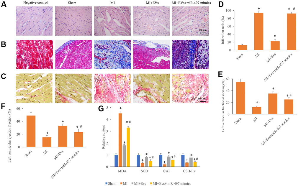 HE, Masson, and Sirius Red Staining were used in this study to investigate the influence of EVs and miR-497 on the morphological changes of MI rats. Well-arranged and possessed intact muscle fibers were observed in the group sham and MI+EVs through HE staining (Figure 3A). However, remarkable necrosis and irregularly arranged muscle fibers were found in the group MI and MI+EVs+miR-497 mimics (Figure 3A). Meanwhile, the results of Sirius red and Masson staining indicated that markedly increase of collagen deposition and infarction ratio could be observed in the group MI and MI+EVs+miR-497 mimics (Figure 3B–3D). However, obvious decrease of collagen deposition and infarction ratio were found in the group EVs (Figure 3B–3D). EVs also significantly promoted the levels of left ventricular ejection fraction and left ventricular fractional shortening (Figure 3E, 3F) compared with group MI. The levels of left ventricular ejection fraction and left ventricular fractional shortening were suppressed markedly by overexpression of miR-497 (Figure 3E, 3F). The levels of MDA, SOD, CAT, and GSH-Px in the serum were also investigated. In the group MI+EVs, the content of MDA was significantly suppressed, but the levels of SOD, CAT, and GSH-Px were remarkably increased compared with group MI (Figure 3G). However, simultaneous treatment with miR-497 mimics markedly reversed the influence of EVs indicating that EVs might improve cardiac function through targeting miR-497.