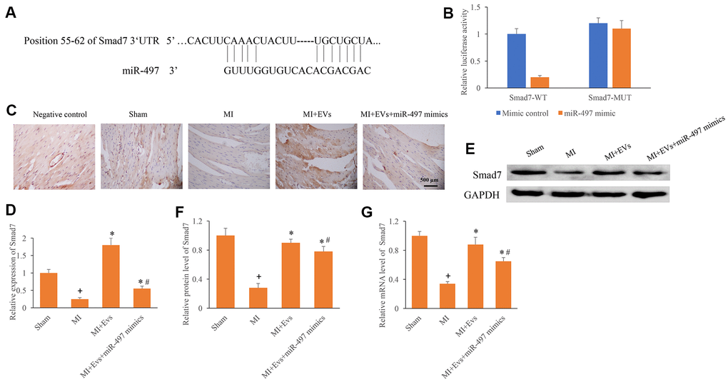 The potential binding target of miR-497 was predicted and identified. The direct binding site between miR-497 and Smad7 was identified (Figure 4A, 4B). In addition, the expression of Smad7 was measured using IHC, western blotting, and PCR methods. We found that the expression of Smad7 in the group MI was remarkably inhibited compared with group sham. However, EVs significantly promoted the expression of Smad7, but the increased of Smad7 could be reversed by overexpression of miR-497 (Figure 4C–4G). Therefore, EVs might regulate the repair of cardiac function in MI rats through targeting miR-497/Smad7 axis.