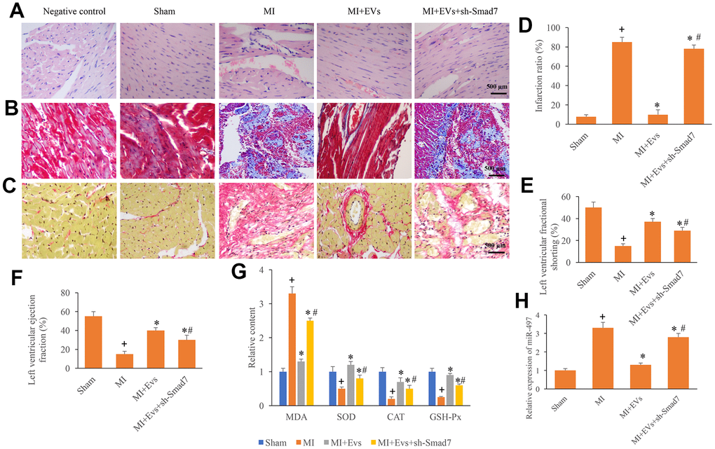To further unfold the role of Smad7 in the process of MI, knockdown of Smad7 was constructed. We found that EVs could significantly improve the myocardial remodeling, decrease the level of collagen deposition and infarction ratio (Figure 5A–5D). However, knockdown of Smad7 remarkably reversed the influence of EVs, and increased the levels of collagen deposition and infarction ratio (Figure 5A–5D). Meanwhile, the increase of left ventricular ejection fraction and left ventricular fractional shortening induced by EVs were also suppressed by sh-Smad7 (Figure 5E, 5F). Similar influencing trends were observed in terms of the contents of MDA, SOD, CAT, and GSH-Px in the serum. In the group MI+EVs, the expression of MDA was significantly inhibited, but the levels of SOD, CAT, and GSH-Px were remarkably increased compared with group MI (Figure 5G). However, simultaneous treatment with sh-Smad7 markedly reversed the influence of EVs. Meanwhile, we found that sh-Smad7 could reverse the influence of EVs on the expression of miR497 (Figure 5H). Therefore, Smad7 might be one potential function target of EVs on miR497. These findings indicate that EVs might improve cardiac function through targeting miR-497/Smad7 axis.