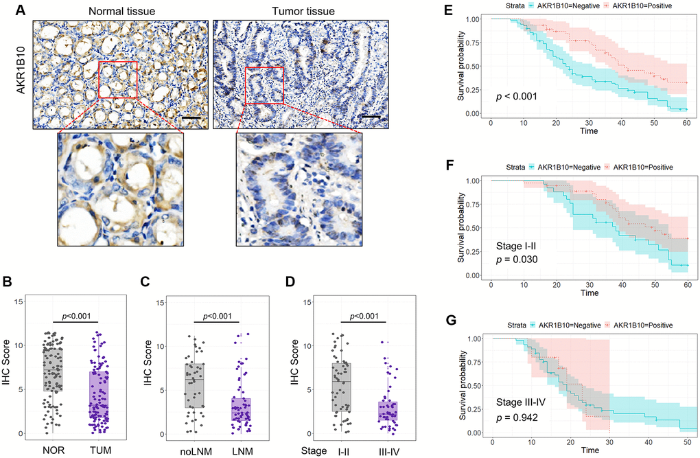 In accordance with IHC scores, patients who expressed AKR1B10 positive or negative were divided into different subgroups. Results indicated the fact that AKR1B10neg patients suffered worse post-surgery overall survival than that of AKR1B10pos patients (Figure 1E). Interestingly, In patients with TNM stages I–II, maintained AKR1B10 expression was associated with favorable in patients with TNM stages I–II but not stage III–IV patients (P = 0.030; P = 0.942; Figure 1F–1G).