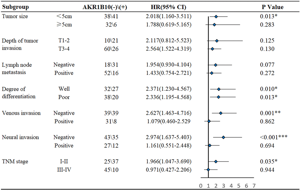 A summary about AKR1B10 and clinico-pathological characteristics was made in Table 1. The expression of AKR1B10 had significant association with tumor size (P < 0.001), depth of invasion (P < 0.001), lymph node metastasis (P < 0.001), venous invasion (P = 0.002), and TNM stage (P < 0.001), while no correlation with other clinicopathological variables such as age, gender, degree of differentiation or neural invasion (P > 0.05). Additionally, AKR1B10 can be used as a single factor to predict univariate risk, determined by Cox's proportional hazard model analysis (Table 2).