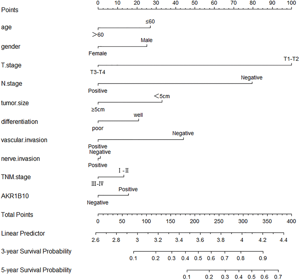 Age, gender, tumor size, differentiation, vascular invasion, neural invasion, TNM stage, and AKR1B10 expression were applied to evaluate 3- and 5- year OS. The nomogram gave every prognostic variable a score on the point scale. We obtained scores associated with each prognostic variable and calculated the overall score (Figure 3).