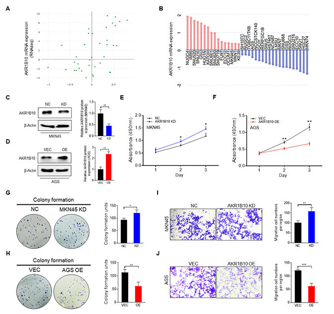 Due to the fact that AKR1B10 expressed highly in MKN45 cells and low in AGS, MKN45 cells were transfected with control- or AKR1B10-shRNA to knockdown AKR1B10. AGS cells were transfected with vector or AKR1B10 overexpression plasmid to amplify AKR1B10 (Figure 4C–4D). For further analyzed the biological characteristics of AKR1B10, we conducted knockdown (KD) and overexpression (OE) constructs. What we found is that AKR1B10-KD increased cellular proliferation ability, whereas that of AKR1B10-OE was reduced (Figure 4E–4F). Consistent with these findings, AKR1B10-KD cells strengthened colony-formation (Figure 4G–4H) and migration (Figure 4I–4J) ability, whereas AKR1B10-OE cells indicated reversed impacts.