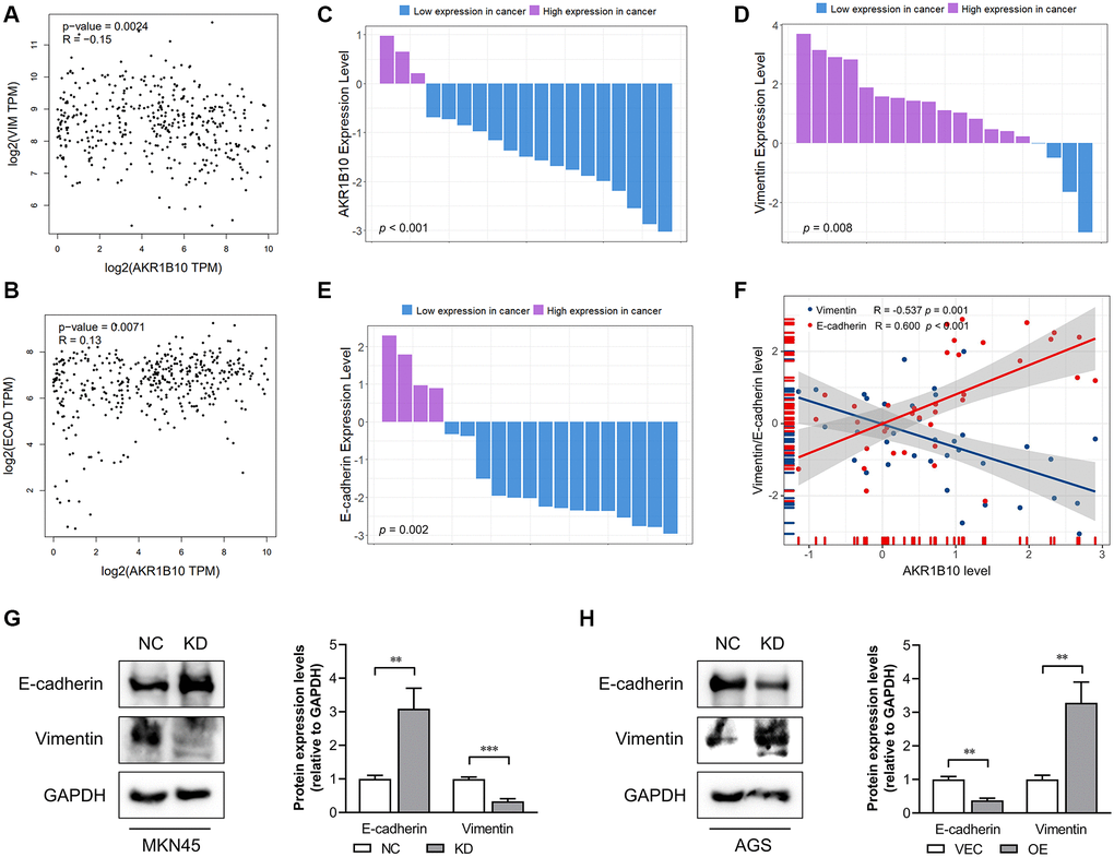 AKR1B10 regulated the ability of GC cells to proliferate and migrate negatively. However, EMT is closely related to migration of tumor cells. Therefore, what deserves further determination is whether AKR1B10 affect EMT of tumor or not. Correlation between AKR1B10 mRNA expression and EMT-related gene expression was analyzed in GC specimens from the TCGA dataset by the GEPIA platform. Specifically speaking, between AKR1B10 mRNA expression and EMT-related genes, including Vimentin (Figure 5A), Snail family transcriptional repressor 1, 2 (SNAI1, 2 Supplementary Figure 3A, 3B), zinc finger E-box binding homeobox 1, 2 (ZEB1, 2 Supplementary Figure 3C, 3D), signified a negative correlation, whereas correlated with E-cadherin positively (Figure 5B).