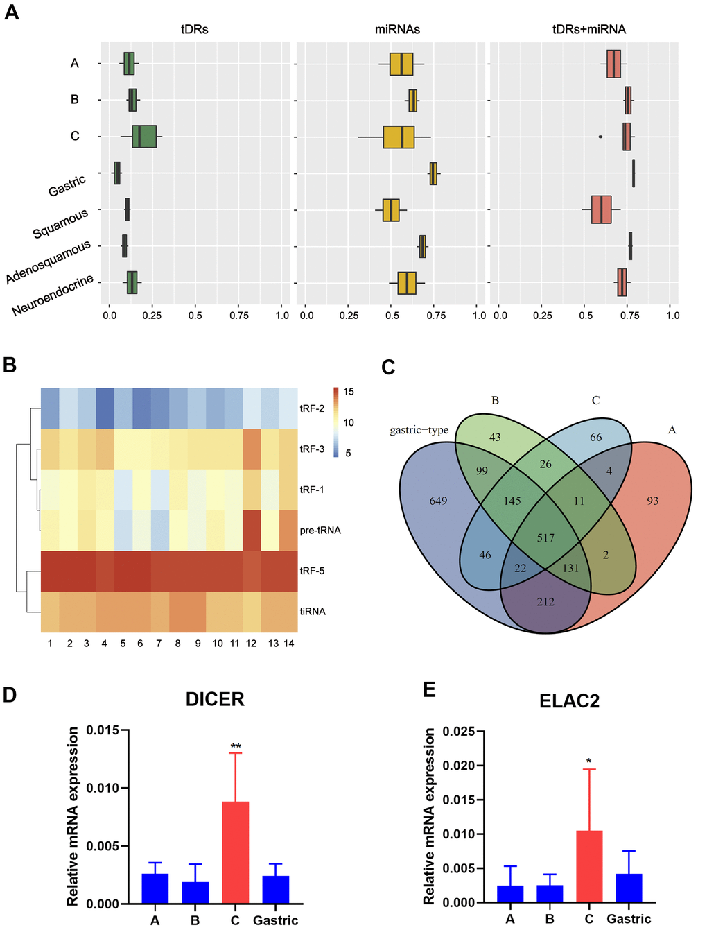 First of all, the small RNA profiles of the 14 EAC samples with different histological subtypes were shown in Figure 1A. In EAC samples, miRNAs and tDRs accounted for about 75% of all mapped reads. Through literature review, we found that this phenomenon not only exists in EAC, but also in other different types of human samples [19]. In order to further confirm this phenomenon, we performed small RNA sequencing on another six squamous and adeno-squamous cervical cancer samples. There was no significant difference in the fraction of transcriptome-aligned reads for different histologic subtypes of cervical cancer and the total number of tDRs and miRNAs remained relatively balanced. To analyze tDRs reads in further detail, we grouped tDRs based on their biogenesis and relative length. In all subtypes of tDRs, tRF-5 was predominant in abundance (Figure 1B). The Venn diagram shows that EAC of Silva pattern A, B, C and Gastric subtype have great differences in the distribution of tDRs types based on the anticodon of amino acids (Figure 1C). Since tDRs are produced by endonuclease RNase Z, Dicer 1 and ANG, we next compared the expression of these genes between different subtypes of EAC. As shown in Figure 1D, 1E, the expression of Dicer1 and ELAC2 in pattern C was significantly higher than that of other subtypes (Pv0.05, Student T test). Collectively, we discovered that differentially expressed miRNAs and tDRs existed in different histological types of EAC indicating potential clinical value.