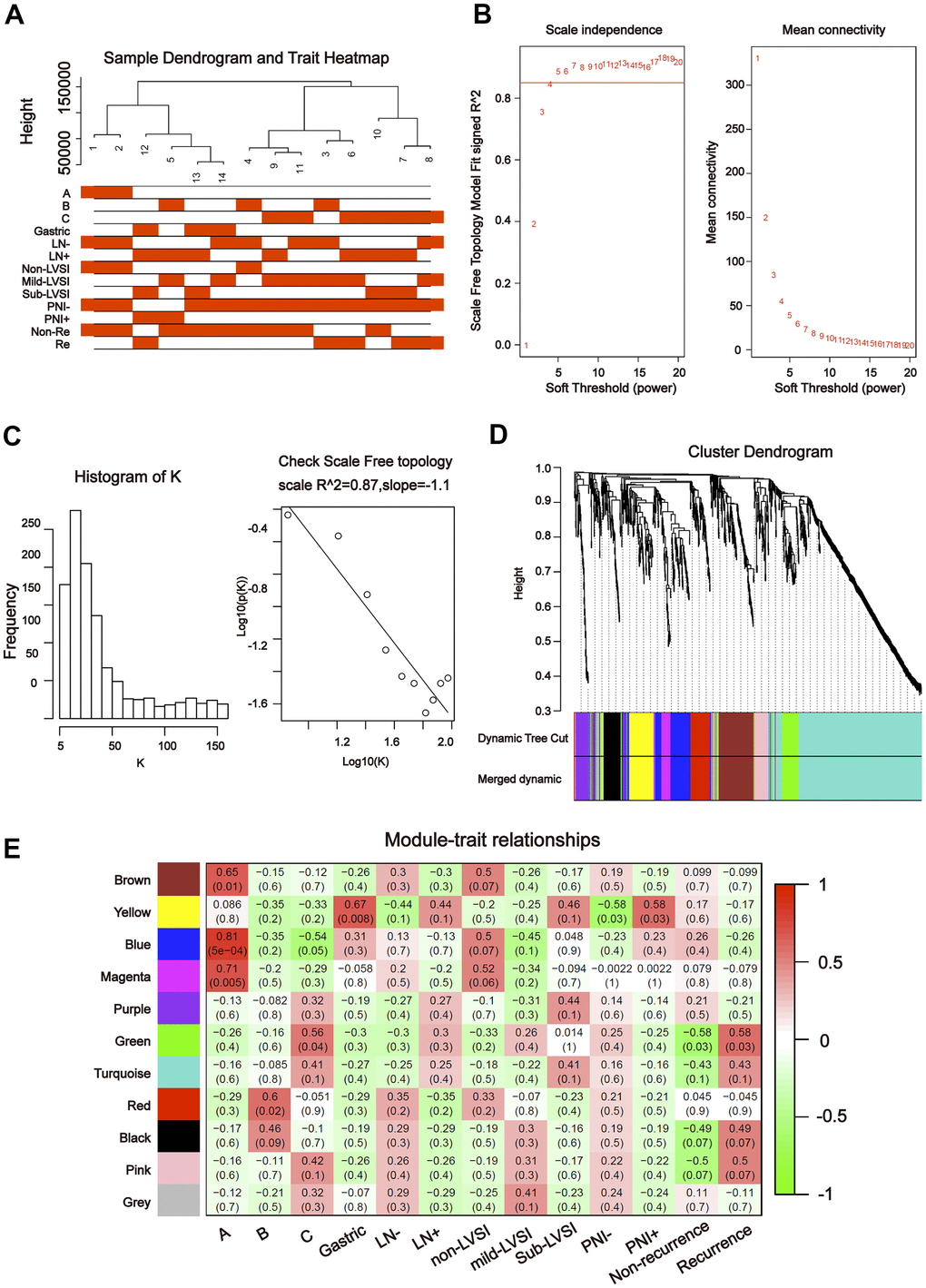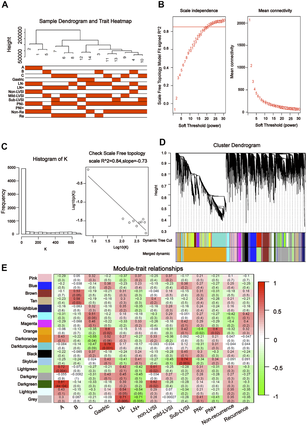 To further explore the association between the differentially expressed miRNAs and tDRs and clinical traits, we conducted weighted gene co-expression network analysis (WGCNA). The investigated clinical phenotypes included Silva pattern A/B/C/Gastric subtypes, non-LNM (lymph node metastasis)/LNM, non-LVSI/mild-LVSI/Substantial-LVSI, non-PNI (perineural invasion) /PNI and non-recurrence/recurrence (Figure 2A). By setting soft-thresholding power as 4 (scale free R2 = 0.87) and cut height as 0.25, we identified 10 modules (Figure 2B–2D; non-clustering miRNA/tDRs shown in grey) in the miRNA profile. As shown in Figure 2E, some modules correlated significantly (P < 0.01) with some of the indicated variables. The blue module was positively correlated with Silva pattern A (R =0.81, P < 0.001) and the yellow module was positively correlated with Gastric subtype (R =0.67, P < 0.01). By setting soft-thresholding power as 20 (scale free R2 = 0.84) and cut height as 0.25, we identified 16 modules (Figure 3A–3D; non-clustering DEGs shown in grey) in the tDRs profile. The dark green module was positively correlated with the Silva pattern A (R =0.81, P < 0.001) while the dark turquoise module was significantly associated with the Gastric subtype (R =0.78, P < 0.005). Moreover, the sky blue module was positively correlated with the substantial-LVSI (R =0.81, P < 0.001) (Figure 3E).