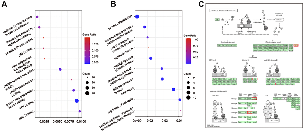 To further understand the relationship between modules and clinical phenotypes, we screened for the hub miRNAs or tDRs in specific modules. The cut-off values of miRNA/tDRs were: module membership (MM) >0.8, correlation coefficient of clinical trait > 0.7, and the counts of per million mapped reads (CPM) > 100. Notably, four miRNA/tDRs were identified from the miRNAs and tDRs profiles in the miRNA-based blue coexpression module and tDRs-based dark green coexpression module to be positively associated with the Silva pattern A, including hsa-miR-101-3p, hsa-miR-195-5p, tRF-1:32-Val-CAC-3 and tRF-1:28-Gly-CCC-2. To demonstrate potential biological functions of the hub miRNA/tDRs for Silva pattern A, we performed GO and KEGG analyses with the target genes of the miRNA/tDRs and concluded that the most enriched signal pathways for the Silva pattern A were focal adhesion and PI3K-Akt-mTOR signaling pathways which were common tumorigenesis-related pathways (Figure 4A, 4B). In addition, three miRNA/tDRs were identified positively associated with the Gastric subtype, including hsa-miR-214-3p, Other-13:26-tRNA-Lys-CTT-1-M11 and Other-2:23-tRNA-Val-AAC-1-M7. GO and KEGG analysis showed that cadherin binding involved in cell-cell adhesion was the most enriched signal pathway for Gastric subtype, potentially implying a unique cell-cell interaction (Figure 5A). Furthermore, a total of 3 hub tRNAs were discovered positively associated with substantial-LVSI, including other-14:33-tRNA-Lys-CTT-1-M2, other-3:35-tRNA-Lys-CTT-1-M2 and other-14:28-tRNA-Lys-CTT-10. GO and KEGG analysis suggested that the most relevant pathway was ubiquitin mediated proteolysis pathway (Figure 5B, 5C). To summarize, we identified several hub miRNA/tDRs closely associated with significant clinical phenotypes such as Silva pattern A, gastric subtype and substantial LVSI exhibiting concordant biological functions.