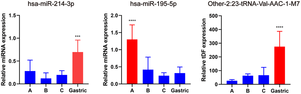Subsequently, qRT-PCR was used to validate the expression of the hub miRNAs/tDRs that were identified from WGCNA analysis in EAC samples, including seven tDRs and two miRNAs. Among them, the expression of the following four tRNAs (other-14:33-tRNA-Lys-CTT-1-M2, tRF-1:32-Val-CAC-3, tRF-1:28-Gly-CCC-2, and other-14:28-tRNA-Lys-CTT-10) were too low to be quantized with qPCR. No significant differences were found for other-3:35-tRNA-Lys-CTT-1-M2 and Other-13:26-tRNA-Lys-CTT-1-M11 in different subtypes of EAC tissues (P > 0.05), whereas significant differences were verified for hsa-miR-214-3p, hsa-miR-195-5p and Other-2:23-tRNA-Val-AAC-1-M7 (Figure 6) indicating promising value to become potential biomarkers for EAC.