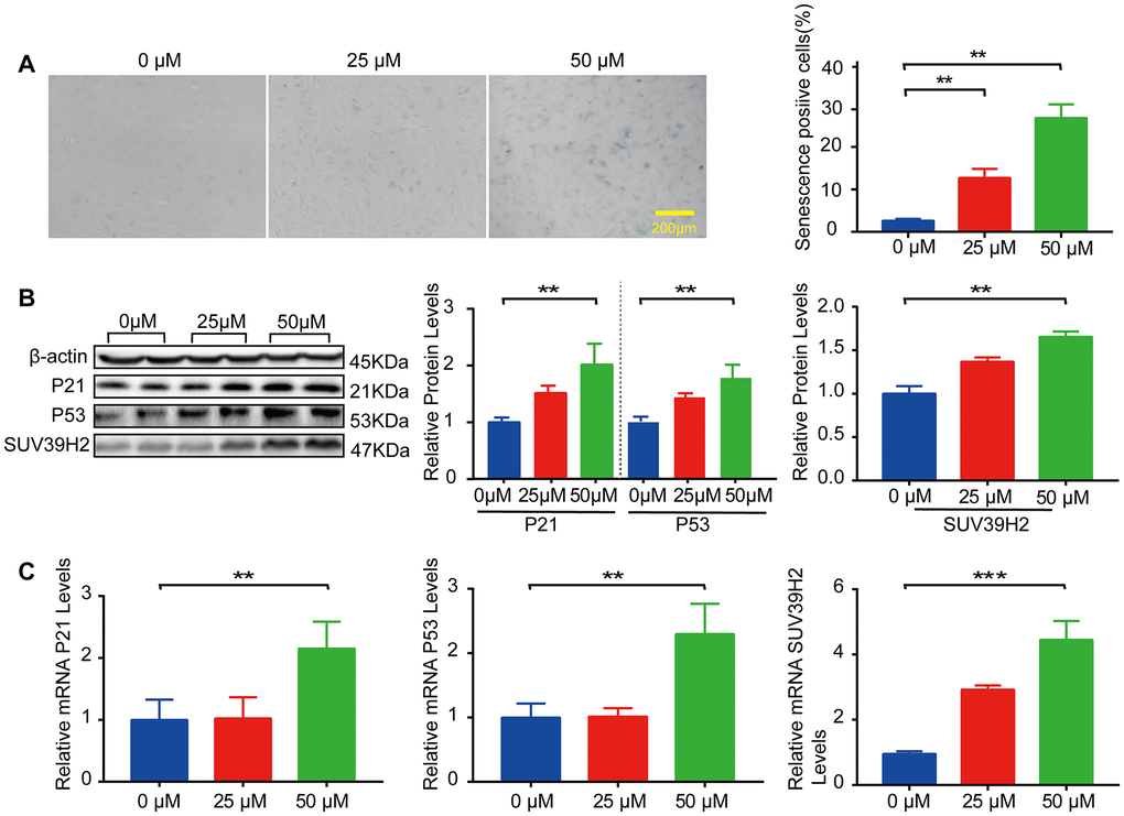 In our study, we used H9C2 cells, a clonal muscle cell line from the rat heart, to perform the experiments. Previous studies have shown that sublethal doses of hydrogen peroxide (H2O2) induce cellular senescence. To select the appropriate concentration of H2O2, an SA-β-Gal staining kit was used to detect the degree of cardiomyocyte senescence. H9C2 cells were increased in senescence-positive areas, and the protein and mRNA levels of senescence markers p21 and p53 were elevated after treatment with 50 μM H2O2 for 48 h (Figure 1A–1C). Subsequently, we examined SUV39H2 expression levels in H9C2 cells after H2O2 stimulation. The results showed that the mRNA and protein levels of SUV39H2 were significantly elevated in H9C2 cells treated with 50 μM H2O2 for 48 h compared with the DMEM control (Figure 1B–1C).