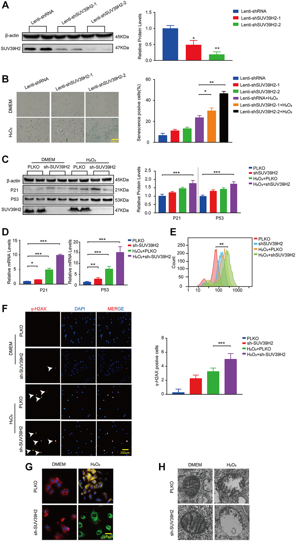 The aforementioned results showed that SUV39H2 expression levels were augmented in H9C2 cells upon H2O2 stimulation. To investigate the correlation between cell senescence and SUV39H2 expression in H2O2-treated H9C2 cells. We constructed an SUV39H2-knockdown plasmid and created a control cell line, PLKO. We first used western blotting to measure SUV39H2 expression to test the quality of knockdown efficiency (Figure 2A). Unexpectedly, after knockdown of SUV39H2, the percentage (green) and staining intensity of SA-β-Gal-positive cells in the H9C2 cell line increased significantly (Figure 2B). Next, we measured telomerase activity through quantified three telomerase genes (Tert, Terf1, Terf2) levels. It’s necessary for us to know whether mitochondrial dysfunction is involved in cardiomyocyte senescence process. According to the result, we used lenti-sh3-SUV39H2 (hereinafter referred to as lenti-shSUV39H2) for all follow-up experiments. Next, western blotting and RT-PCR was used to detect the expression of p53 and p21 in the H9C2 SUV39H2-knockdown cell line, which was consistent with the results of SA-β-Gal staining (Figure 2C, 2D). Oxidative stress has been reported to be related to the aggravation of cell senescence [14]. Therefore, we used flow cytometry to detect the reactive oxygen species (ROS) concentration in H9C2 cells using 2-dichlorofluorescein diacetate (DCFH-DA) (Figure 2E). Given that ROS derive predominantly from mitochondria, we further used electron to detect the morphology of mitochondria. In addition, immunofluorescence was used to detect the fluorescence intensity of γ-H2AX and JC-1 staining in each group of cells (Figure 2F, 2G). Red fluorescence represents JC-1 aggregate and green fluorescence denotes JC-1 monomer. And electron microscope showed larger and swollen mitochondria in knockdown SUV39H2 H9C2 cells (Figure 2H). As shown in Figure 2G, knockdown SUV39H2 H9C2 cells show relatively significantly higher frequency of mitochondrial depolarization events (green). These results suggest that knockdown of SUV39H2 can cause mitochondrial dysfunction and significantly increase the accumulation of ROS in H9C2 cells, then damage the DNA.