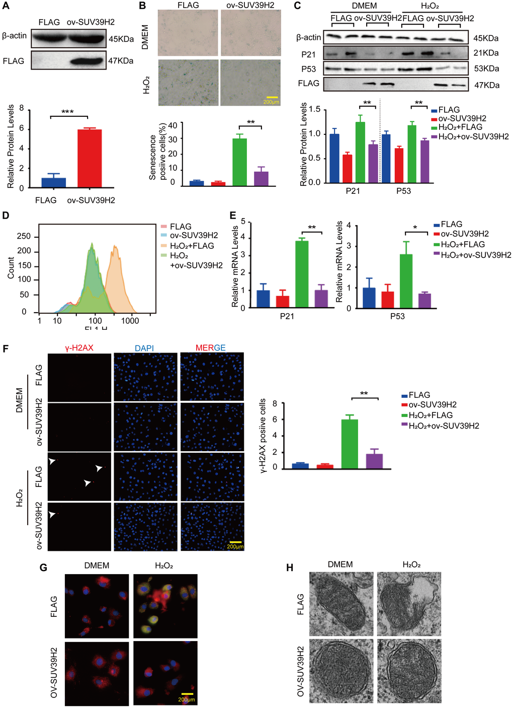 Next, we investigated whether SUV39H2 overexpression had any effect on H9C2 senescence. We constructed a SUV39H2-overexpression plasmid and used lenti-FLAG as a control (negative control) to form a stable H9C2 cell line. As shown in Figure 3A, SUV39H2 expression was prominently increased in H9C2 cells infected with lenti-SUV39H2. The results of SA-β-Gal staining also showed that overexpression of SUV39H2 significantly reduced the number of senescent-positive cells (Figure 3B). When compared with the lenti-FLAG group, p53 and p21 levels were also significantly decreased after SUV39H2 overexpression. (Figure 3C). Consistent with the above results, we evaluated the levels of oxidative stress, DNA damage, and mitochondrial function in H9C2 SUV39H2-overexpressing cell lines. The results showed that compared with H9C2 cells in the control group, the level of ROS in SUV39H2-overexpressing cell lines decreased (Figure 3D, 3E). In addition, the immunofluorescence results also showed that the expression of γ-H2AX SUV39H2-overexpressing cell lines was down-regulated compared to the control group (Figure 3F). Moreover, this stable cell lines shows no obvious JC-1 monomer signal (green) and damage in mitochondrial morphology (Figure 3G, 3H).