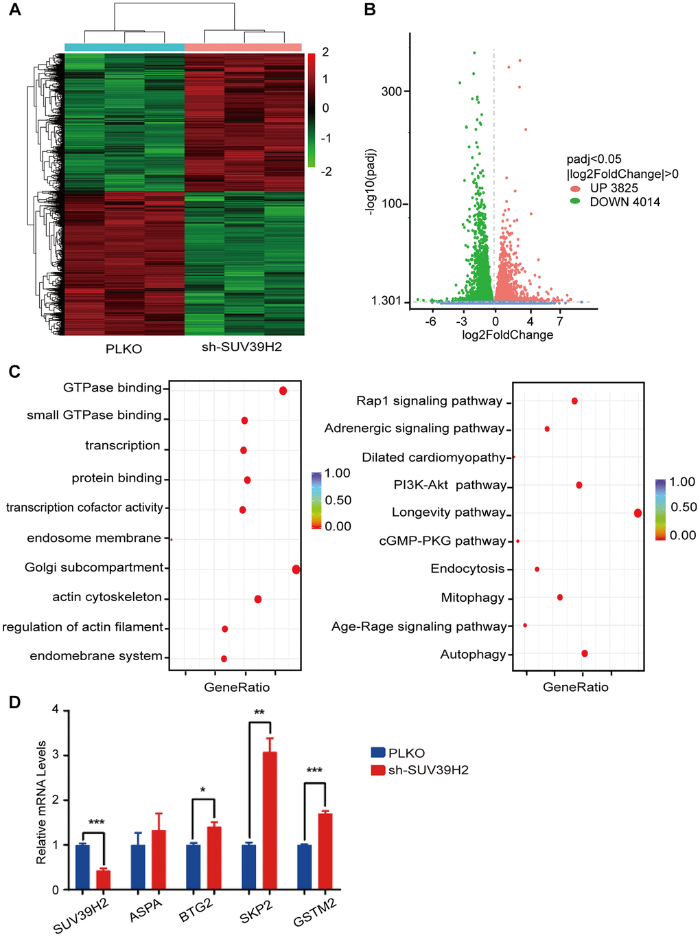 To investigate the inherent anti-aging mechanism of SUV39H2, we used RNA sequencing (RNA-seq) to analyze the gene expression profile of H9C2 SUV39H2-knockdown cell lines treated with H2O2. Compared with the control group, the results showed that 7,839 genes were differentially expressed in the shSUV39H2 group, of which 3,825 genes were up-regulated and 4,014 down-regulated (Figure 4A–4B). We utilized gene ontology (GO) annotation analysis to help identify differentially expressed genes targeted by SUV39H2. The results showed that most of the differentially expressed genes were related to biological processes rather than molecular functions and cellular components. Kyoto Encyclopedia of Genes and Genomes (KEGG) pathway analysis showed that the differentially expressed genes were enriched for the longevity-regulating pathway, cGMP-PKG signal pathway, PI3K-Akt signal pathway, Rap1 signal pathway, and autophagy-related pathways (the 10 pathways with the highest enrichment scores) (Figure 4C). According to the results of GO and KEGG analyses, we found that a large number of differentially expressed genes were mainly related to cell growth and proliferation-related pathways, which may be the key to cardiomyocyte senescence induced by H2O2. Quantitative real time PCR (qPCR) was used to confirm the initial results obtained by RNA-seq, and we found four up-regulated genes, including SUV39H2, which is consistent with our sequencing results (Figure 4D). And this results can be repeated by another shRNA (sh2-2-SUV39H2) (Supplementary Figure 1A).