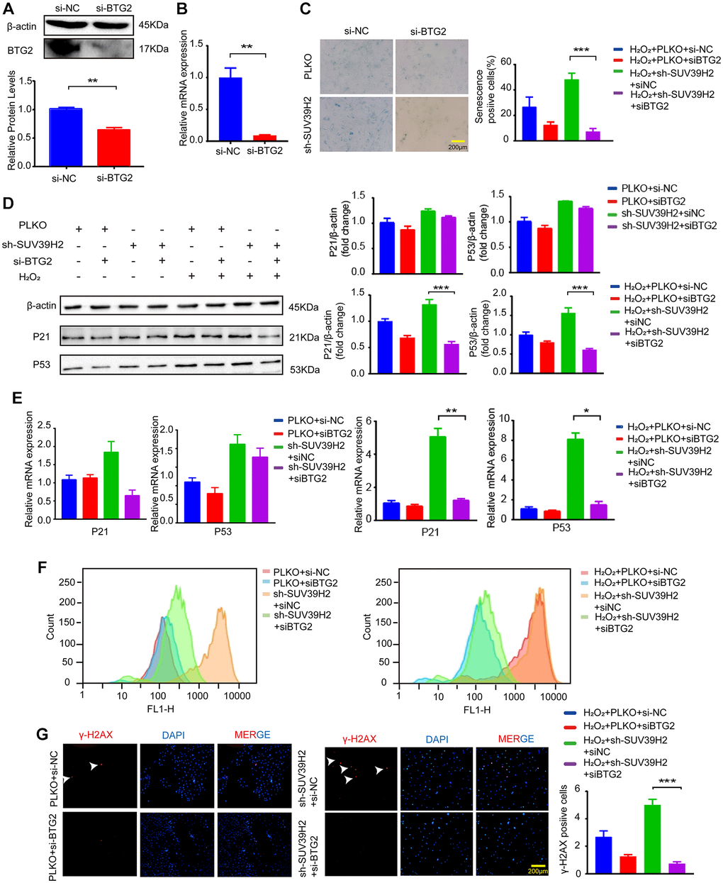 Based on the above results, to determine the downstream genes of SUV39H2, we constructed siRNA for four selected genes and used si-NC (negative control) as a control. RT-PCR was used to test up-regulated genes’ siRNA knockdown efficiency, and the knockdown efficiency of siBTG2-1 and siBTG2-3 was not satisfactory (Supplementary Figure 1B, Figure 5A–5F, Figure 6A–6B). Therefore, we used siBTG2-2 (hereinafter referred to as siBTG2) for all follow-up experiments. We then examined the impact of the four siRNAs on the knockdown of SUV39H2 in H9C2 cells when treated with H2O2. Our results showed that only BTG2 knockdown largely rescued H9C2 cells from cell senescence induced by SUV39H2 knockdown (Figure 5G, Figure 6C–6E). The fluorescence intensity of ROS and γ-H2AX also showed that si-BTG2 induced low oxidative stress and low DNA damage in H9C2 cells (Figure 6F–6G). Overall, these results indicate that SUV39H2 inhibits cell senescence by regulating BTG2 expression.