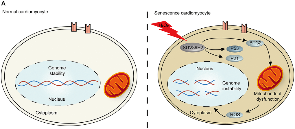 BTG2/PC3 has been shown to stimulate senescence through regulation by p53 [24]. Another study showed that the expression of BTG2 regulates the G1/M cell cycle transition by promoting the expression of CDK4 [25, 26]. To examine the influence of BTG2 on the cell senescence of SUV39H2-knockdown cardiomyocytes, we showed that knockdown of BTG2 by siRNA reversed the senescence aggravated by knockdown of SUV39H2 in H2O2-treated H9C2 cells (Figure 6C–6G). Thus, we consider BTG2 a master regulator downstream of SUV39H2 in the process of cardiomyocyte senescence (Figure 7A).