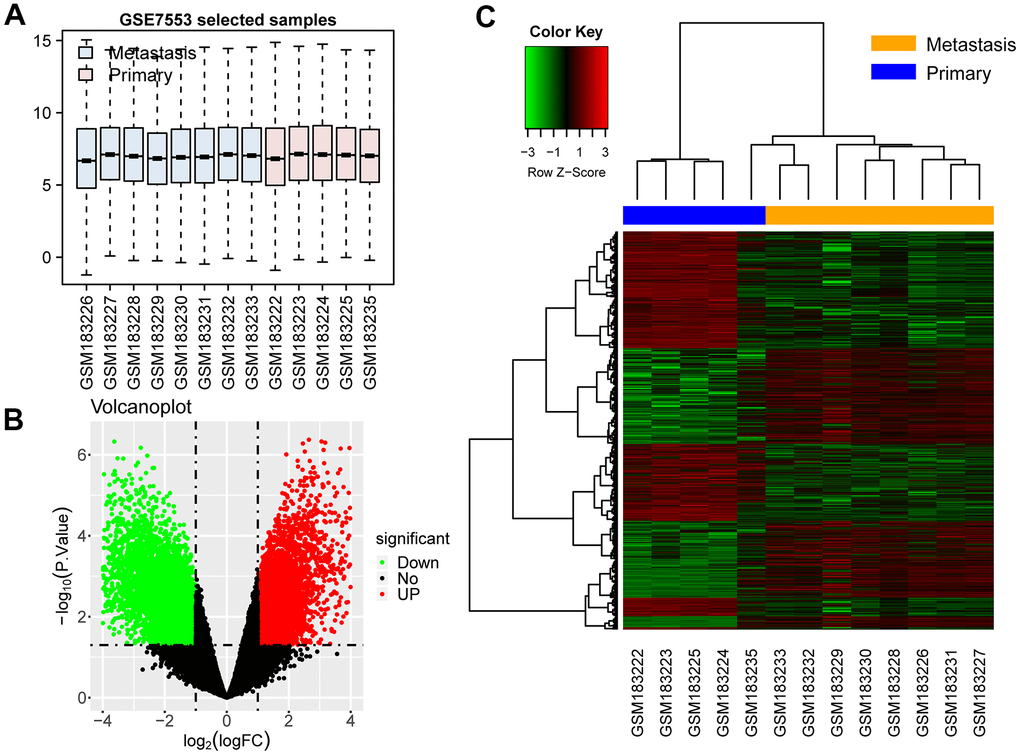 The expression data of the GSE7553 sequence were obtained from the GEO database, and the DEGs were calculated using Limma package. A total of 10,089 DEGs were screened out in accordance with the screening criteria. Among them, 4641 genes were upregulated (46.00%) and 5448 were downregulated (54.00%). The gplots software package was used to draw a box plot of sample expression. All DEGs were drawn using volcano maps and cluster heat maps (Figure 1). The results showed that the samples of melanoma metastases were clustered together. The samples of melanoma primary tumors were also clustered together, indicating that the samples in each group had similar expression patterns and high reproducibility.
