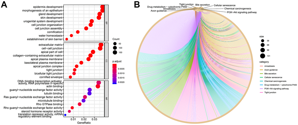 A total of 10,089 DEGs were annotated via ClusterProfiler to further annotate the functions of DEGs and obtain the pathways that the DEGs participated in. This software package helped significantly enrich these DEGs into 1597 biological processes (BPs), including epidermal development, skin development, and epidermal cell differentiation; 166 cell components, including cell–cell junction, extracellular matrix, and cornified envelope; and 205 molecular functions, including Rho guanyl-nucleotide exchange factor activity, Ras guanyl-nucleotide exchange factor activity, and DNA-binding transcription activator activity (Figure 2A). ClusterProfiler was also used to enrich the Kyoto Encyclopedia of Genes and Genomes (KEGG) pathway for these DEGs, and the pathways important for this study were obtained. These 10,089 DEGs were significantly enriched in 74 KEGG pathways. Among them, the PI3K-AKT signaling pathway was enriched by the largest number of DEGs (131 DEGs). This pathway was also the focus of this study (Figure 2B). It contained the key genes CDK2, CDK4, KIT, and Von Willebrand factor (VWF).
