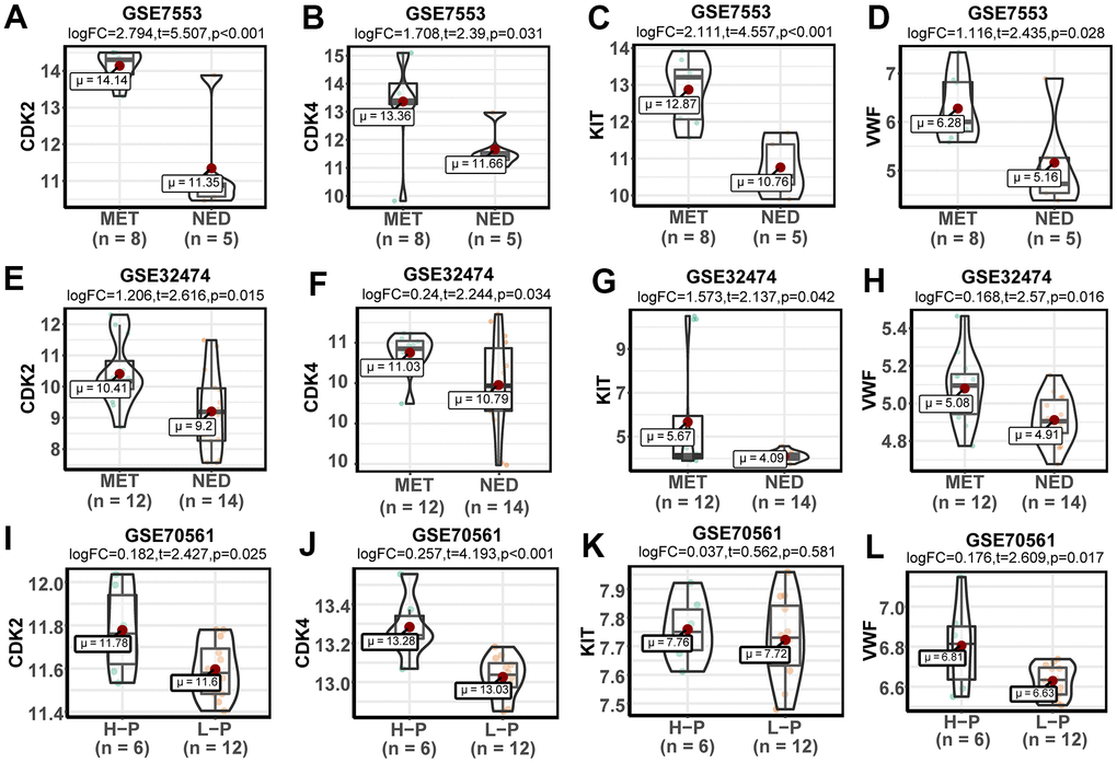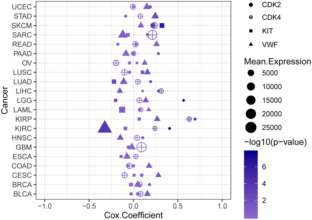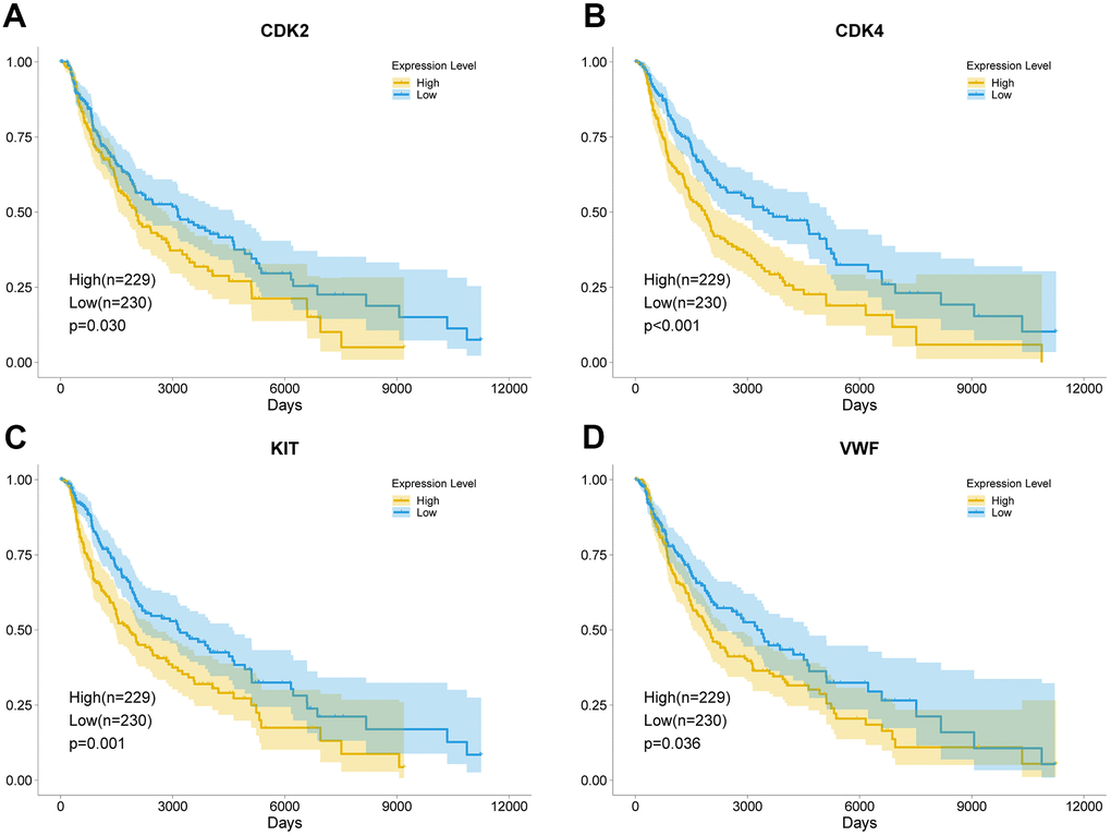 Further analysis was conducted to verify the expression of DEGs and study the effect of the key genes on the prognosis of patients. In the GSE32474 dataset, the expression levels of CDK2, CDK4, KIT, and VWF in the melanoma metastasis group were significantly higher than those in the melanoma primary focus group (t = 2.616, 2.244, 2.137, and 2.570, respectively; logFC = 1.206, 0.240, 1.573, and 0.168, respectively; p < 0.05). The results were consistent with the analysis results in the GSE7553 dataset for CDK2, CDK4, KIT, and VWF (t = 5.507, 2.390, 4.557, and 2.435, respectively; logFC = 2.794, 1.707, 2.110, and 1.116, respectively; p < 0.05). Similarly, the expression levels of CDK2, CDK4, KIT, and VWF in the melanoma cells with high proliferation capabilities were higher than those in the melanoma cells with poor proliferation capabilities (t = 2.427, 4.193, 0.562, and 2.609, respectively; logFC = 0.182, 0.257, 0.037, and 0.176, respectively; p = 0.025, < 0.001, 0.581, and 0.017, respectively; Figure 3). The results of the survival analysis of patients with melanoma in TCGA demonstrated that the high expression of CDK2, CDK4, KIT, and VWF significantly reduced the survival rate of patients (Figure 4). Furthermore, according to the Cox regression analysis in the OncoLnc database, the Cox coefficients of CDK2, CDK4, KIT, and VWF were all > 0, indicating that the risk ratio > 1. Therefore, the high expression of the four key genes was a risk factor for patients with melanoma (Figure 5).