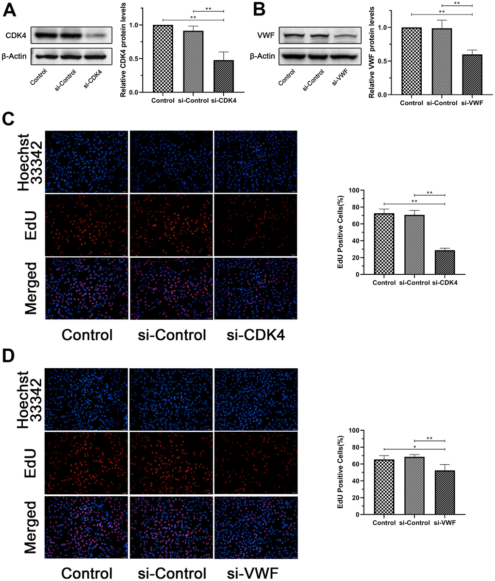 Procedures involving RIPA buffer and protease inhibitors were used to extract and denature proteins from cells. Protein concentration was detected using a BCA reagent. After electrophoresis and membrane transfer operations, the PVDF membrane was sealed in a fast blocking solution for 30 minutes at room temperature, then incubated with CDK4 antibody, VWF antibody, and β-actin antibody (Proteintech, Chicago, IL, USA) on a shaker overnight at 4° C, and finally washed with TBST for three times for 5 minutes each. Finally, the PVDF membrane and the secondary antibody (Proteintech, Chicago, IL, USA) were incubated for 1 hour at room temperature, and an enhanced chemiluminescence (ECL) kit was employed for visualization.