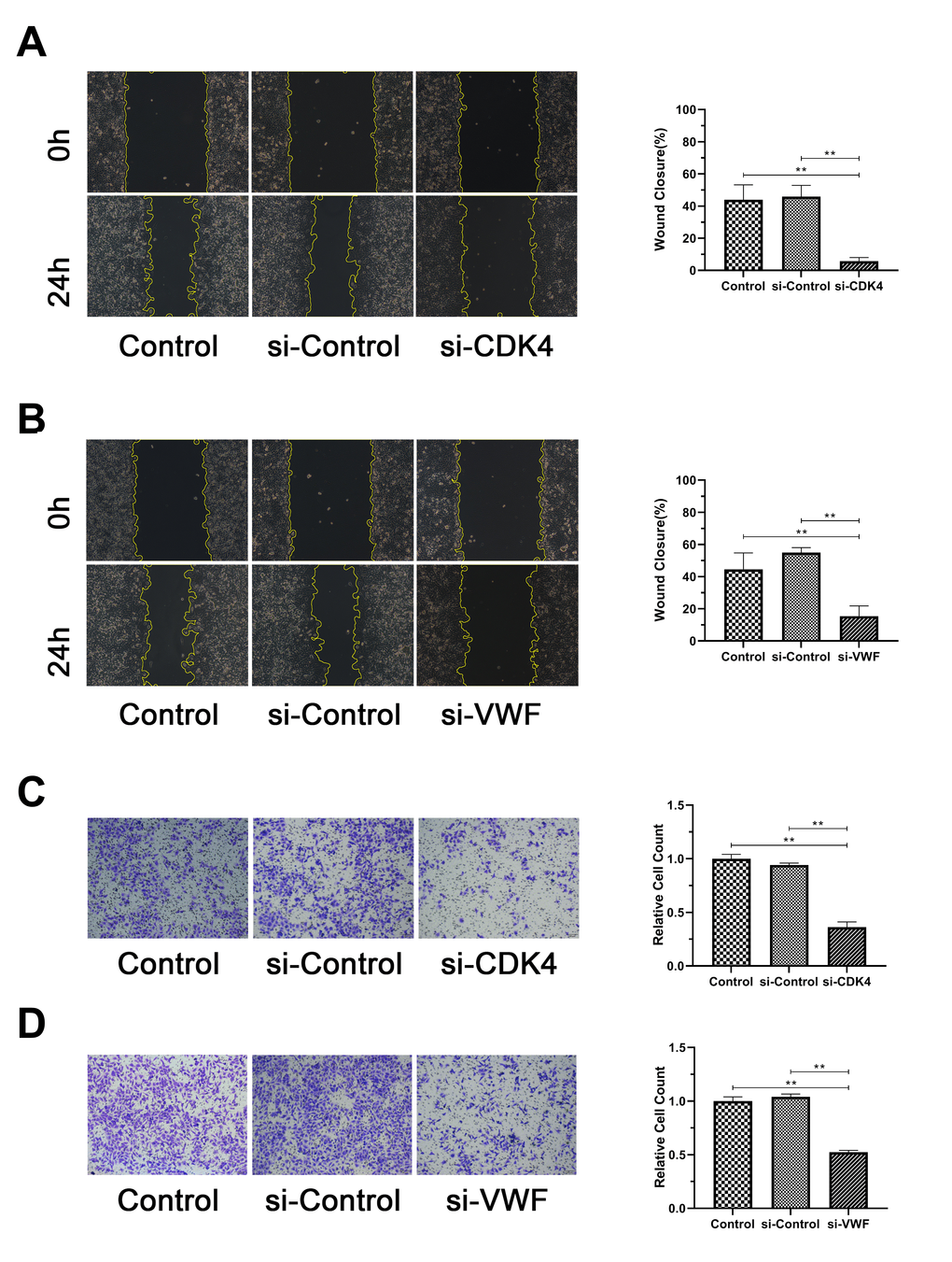 Representative results were selected to confirm the results of the above analysis for the functional verification of human melanoma cells. SiRNA silencing CDK4 and VWF were transfected into MV3 cell line, and the silencing effect was verified by Western blot analysis. The results showed significantly lower CDK4 or VWF expression in the si-CDK4 or si-VWF group, respectively, than in the Control and si-Control group (Figure 6A, 6B). EdU, transwell, and wound healing assays were conducted to verify whether CDK4 or VWF inactivation can affect the proliferation, migration, and invasion of melanoma cells. The results from EdU assay showed that the number of EdU-positive cells was significantly reduced in the si-CDK4 or si-VWF group than in the Control and si-Control groups (Figure 6C, 6D). The findings from wound healing and transwell assays revealed that the closure percentage and the number of invading cells were significantly lower in the si-CDK4 or si-VWF group than in the Control and si-Control groups (Figure 7A–7D). All these results showed that CDK4 or VWF inactivation inhibits the proliferation, migration, and invasion of melanoma.