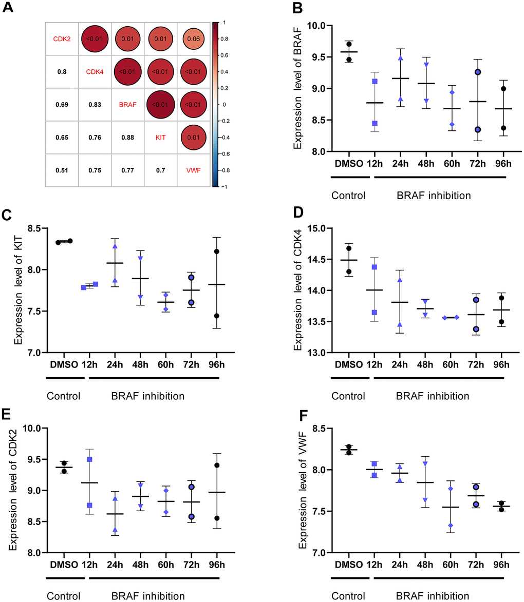 Correlation analysis of gene expression was performed to analyze the microRNA (miRNA) regulatory network of the key genes and further analyze their regulation. First, the GSE58721 microarray data containing samples treated with BRAFV600E inhibitor PLX4720 were analyzed. The results showed that the expression levels of CDK2, CDK4, KIT, and VWF showed a trend of decreasing and then gradually becoming stable compared with those in the control group. This finding indicated that the expression of the four key genes was closely related to that of BRAFV600E (Figure 8). Next, the CyTargetLinker application in Cytoscape, using the miRTarBase 8.0 and TargetScan 7.2 databases, was utilized to draw a visual view of the potential relationship between miRNA and DEGs. The results showed 240 miRNAs that may regulate the expression of the key genes (Figure 9).