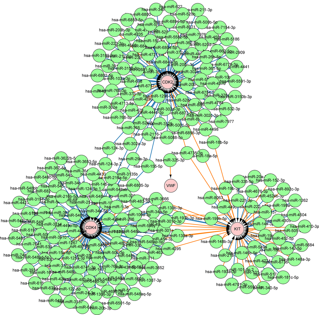 BRAF is a component of the MAPK signaling pathway; it could activate the downstream MEK1 and MEK2 and further lead to the proliferation and metastasis of melanoma [55]. However, developing drug resistance to BRAFV600E inhibitors is common in patients with melanoma [56]. The results of correlation analysis in the present study showed that the inhibition of BRAFV600E could significantly lead to the downregulation of the four key genes. The expression pattern of BRAFV600E was closely related to these four key genes, indicating that the expression of the latter may be partially regulated by BRAFV600E. In melanoma cells with or without BRAFV600E inhibitor resistance, inhibiting the expression of CDK2, CDK4, KIT, and VWF may become a new choice to inhibit the progression of melanoma. MiRNA is small molecule non-encoded RNA. It regulates gene expression post-transcriptionally and suppresses targeted mRNA expression [57]. Studies have shown that miRNA w involved in the regulation of numerous BPs. In the present study, a total of 240 miRNAs were involved in the regulation of the four key genes. Studies have shown that these miRNAs could target the expression of key genes to inhibit the growth of cancer cells. For example, miR-124-3p reduced the progress of hepatocellular carcinoma by inhibiting the expression of target genes, such as CDK2 and CDK4 [58]. By targeting CDK2, miR-885-5p also induced neuroblastoma cell apoptosis and aging [59]. In the study of gastrointestinal stromal tumors, miR-124-3p reduced the viability of tumor cells by inhibiting KIT expression and induced tumor cell apoptosis [60]. Regulating the expression of these miRNAs may also affect the proliferation and metastatic ability of melanoma cells.