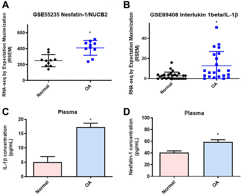 Gene level profiles in OA and normal synovial tissue were obtained from the GEO database and analyzed for levels of nesfatin-1 and IL-1β expression.