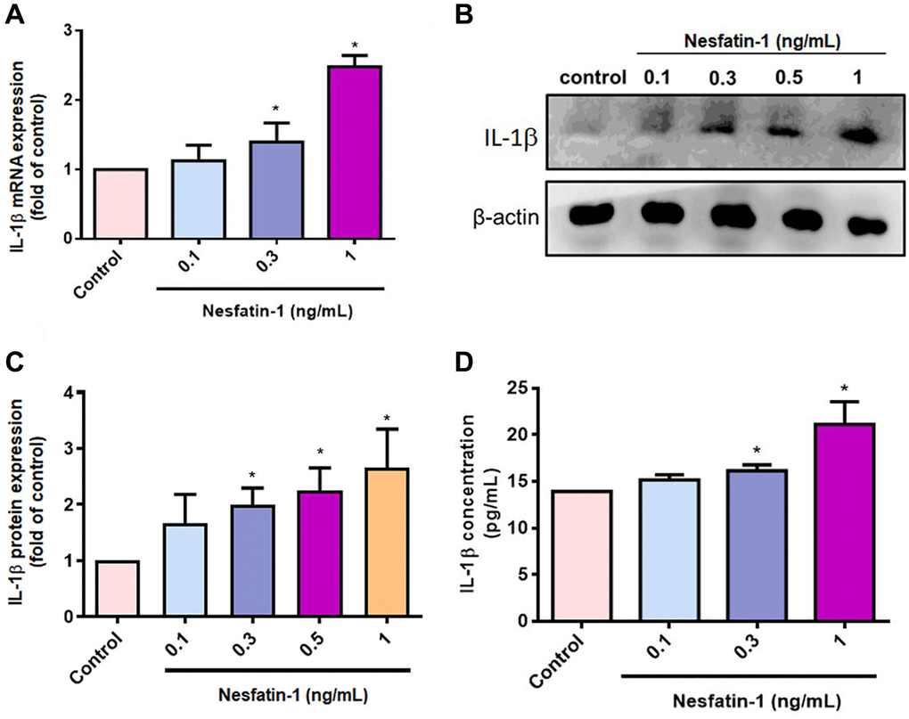 OASFs were treated with pharmacological inhibitors or transfected with siRNAs before being treated with nesfatin-1 for 24 h. IL-1β levels in the medium were then examined using the IL-1β ELISA kit, according to the manufacturer’s procedures.