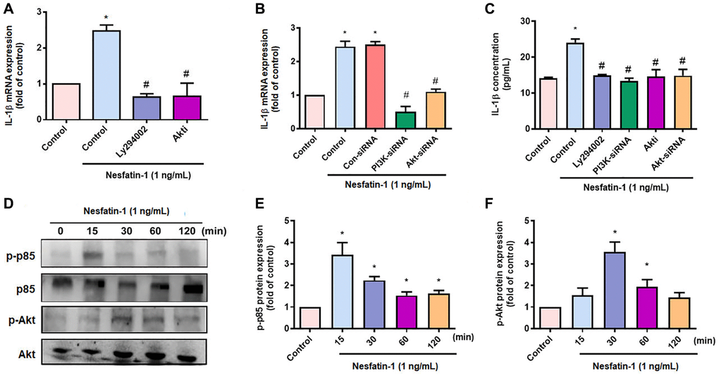 OASFs are critical for maintaining homeostasis of the synovial microenvironment [29]. Treatment of OASFs with nesfatin-1 increased messenger RNA (mRNA) synthesis in a concentration-dependent manner (Figure 2A). Western blot and ELISA assays revealed that nesfatin-1 increased cellular and secreted IL-1β protein expression (Figure 2B–2D). The PI3K and Akt signaling cascade mediates IL-1β expression during the progression of arthritis [25]. Treating OASFs with either a PI3K inhibitor (Ly294002) or an Akt inhibitor (Akti) markedly antagonized nesfatin-1-induced IL-1β synthesis (Figure 3A and 3C). Similar results were observed when the cells were transfected with p85 or Akt small interfering RNAs (siRNAs) (Figure 3B and 3C). Nesfatin-1 treatment time-dependently promoted p85 and Akt phosphorylation in OASFs (Figure 3D–3F), indicating that the PI3K/Akt pathway regulates nesfatin-1-enhanced synthesis of IL-1β in human OASFs.