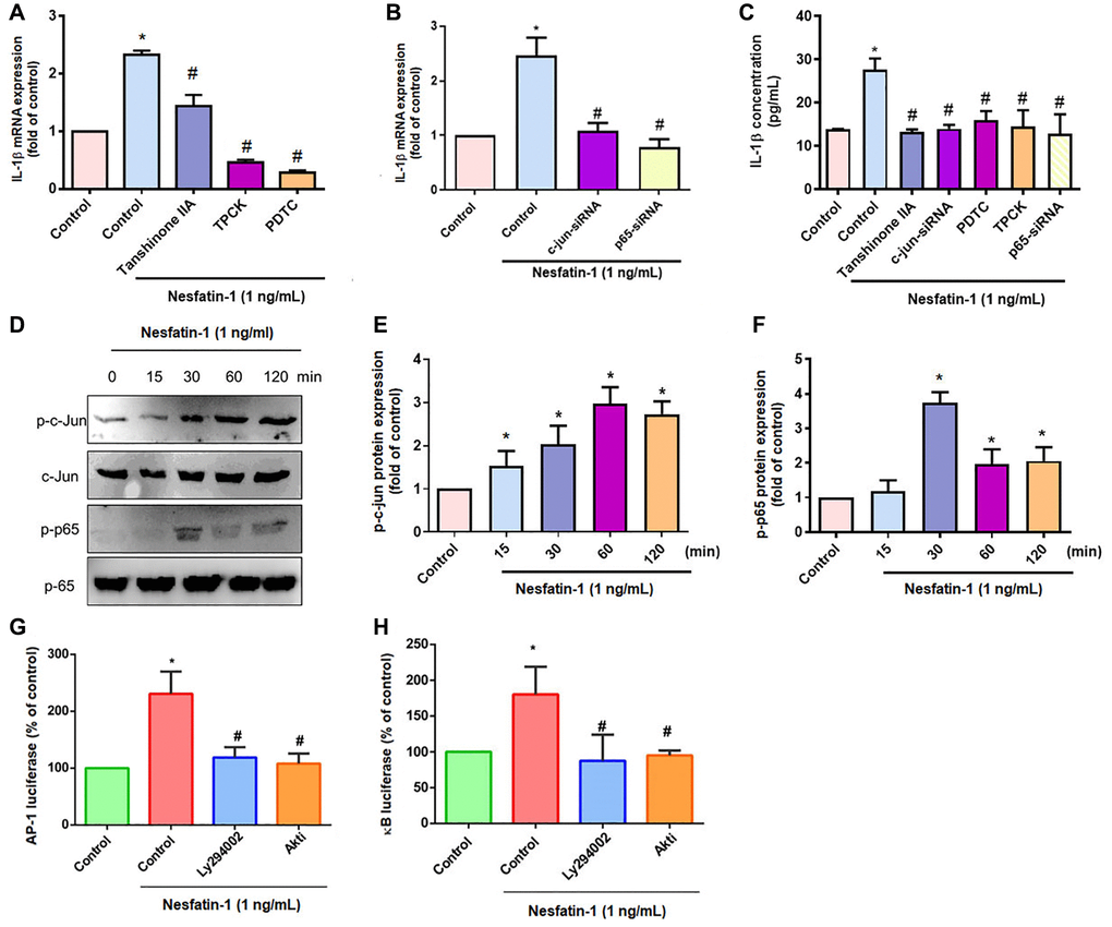 AP-1 and NF-κB transcriptional activities regulate IL-1β-mediated inflammatory responses [33]. Transfection of OASFs with an AP-1 inhibitor (tanshinone IIA) or NF-κB inhibitors (PDTC and TPCK) effectively antagonized nesfatin-1-induced IL-1β expression (Figure 4A and 4C), as did siRNAs against c-Jun and p65 (Figure 4B and 4C), whereas nesfatin-1 facilitated the phosphorylation of c-Jun and p65 (Figure 4C–4F). Stimulation of OASFs with nesfatin-1 enhanced AP-1 and NF-κB luciferase activity, which was reversed by the PI3K and Akt inhibitors (Figure 4G and 4H). These results indicate that nesfatin-1 promotes AP-1 and NF-κB-dependent IL-1β production through the PI3K/Akt pathway.
