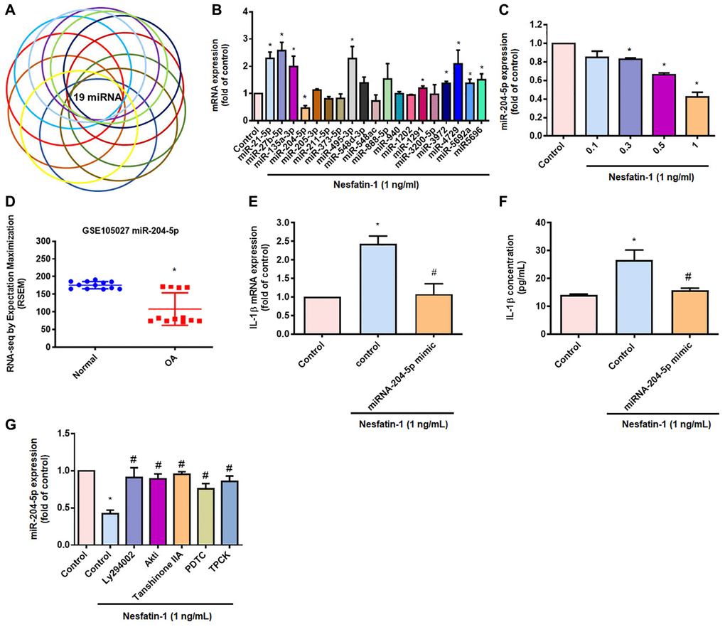 miRNAs post-transcriptionally control gene synthesis [48]. During the development of arthritis disease, aberrant miRNA generation regulates inflammatory cytokine production and cartilage catalysis [48–50]. In particular, the mediation of IL-1β synthesis by miRNAs facilitates the progression of OA [25]. Our analysis of open-source databases identified 19 miRNAs that interfere with IL-1β transcription. Nesfatin-1 markedly inhibited levels of miR-204-5p expression. The analysis of records from the GEO database also found lower miR-204-5p levels in OA patients than in healthy controls. We enhanced miR-204-5p synthesis in human OASFs by transfecting them with a specific miR-204-5p mimic, which markedly inhibited IL-1β expression and cellular inflammatory responses. miR-204-5p expression was negatively associated with levels of IL-1β and proinflammatory cytokines in OA. Moreover, we found that inhibitors of PI3K (Ly2940002), Akt (Akti), AP-1 (tanshinone IIA) and NF-κB (PDTC and TPCK) can increase levels of miR-204-5p expression in human OASFs treated with nesfatin-1. Thus, the results indicated that miR-204-5p synthesis can be regulated by the PI3K/Akt pathway by facilitating the transcription of AP-1 and NF-κB into the nucleus of nesfatin-1-treated human OASFs. Thus, our evidence has identified that miR-204-5p exhibits novel anti-inflammatory properties, although the mechanisms of OA disease are complex and we only examined the in vitro effects of nesfatin-1 in human OASFs. Future work is needed to ascertain the in vivo effects of nesfatin-1 in OA. We suggest that further research should screen for a drug that can inhibit nesfatin-1 expression in inflammatory diseases such as OA.