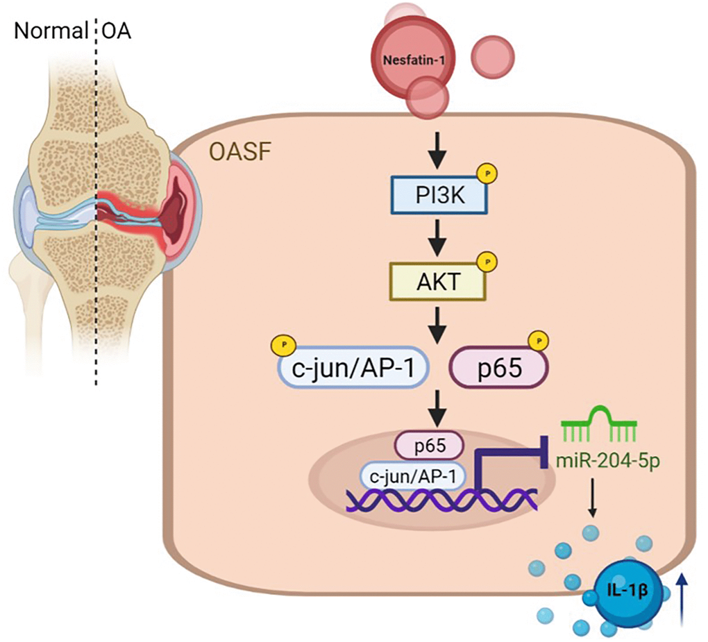 In conclusion, our study has identified that nesfatin-1 facilitates IL-1β production in human OASFs by suppressing miR-204-5p synthesis in the PI3K/Akt, AP-1 and NF-κB pathways (Figure 6). We believe that targeting nesfatin-1 may assist with the management of OA disease.