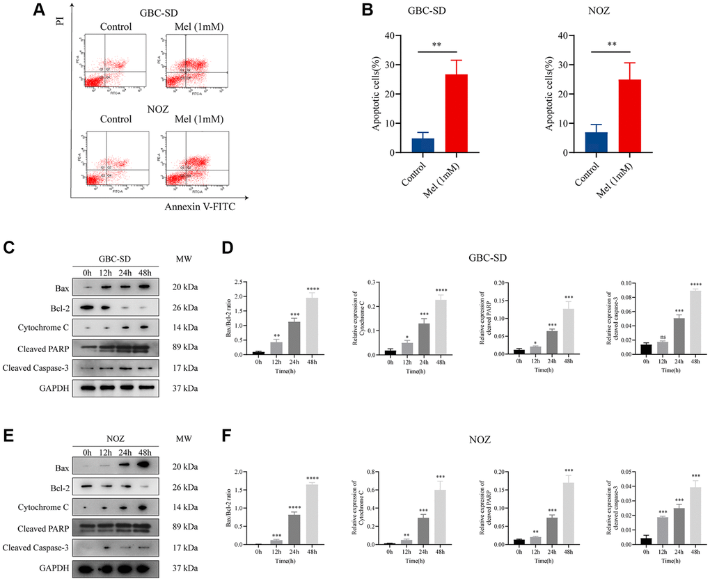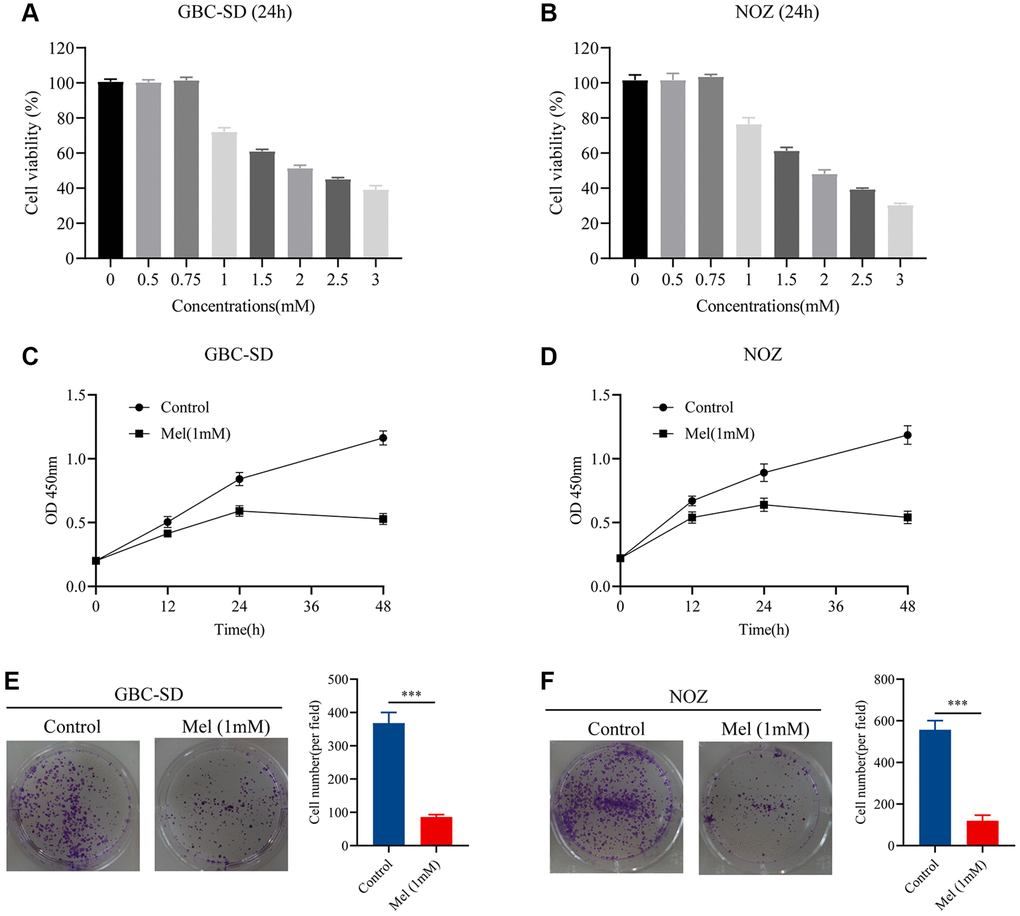 Gallbladder cancer cells were treated with varying melatonin concentrations (0, 0.5, 0.75, 1, 1.5, 2, 2.5, and 3 mM) for 48 h. To identify the anti-proliferative effect of melatonin on NOZ and GBC-SD cells, we detected the cell viability using the CCK-8 assay (Figure 1A, 1B). Tumor cells were then treated with melatonin (1 mM) at different times (0, 12, 24, and 48 h). The results showed that 1 mM melatonin dose-dependently markedly inhibited the cell viability of gallbladder cancer cells (Figure 1C, 1D). Moreover, the colony formation experiment revealed that treatment with melatonin (1 mM) suppressed cell clonogenicity in NOZ and GBC-SD cells (Figure 1E, 1F). Therefore, 1 mM was selected as the appropriate concentration for subsequent experiments.