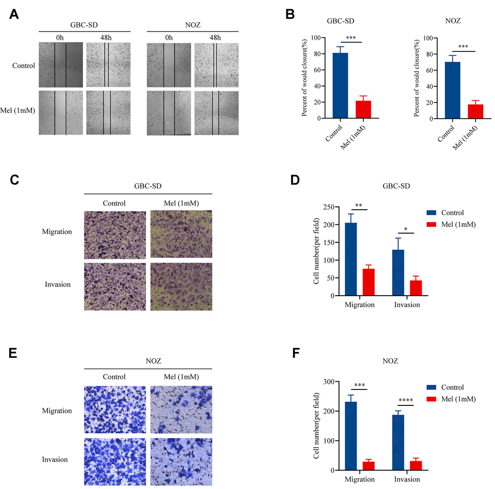 Since cellular motility and invasiveness are key steps in cancer metastasis, we examined the motility as well as invasion of gallbladder cancer cells treated with melatonin (1 mM). Treatment with melatonin (1 mM) restrained the movement of NOZ and GBC-SD cells (Figure 2A). Mean percentage of wound closure was approximately 21.7% and 17.7%, respectively (Figure 2B). In the Transwell assay, both tumor cell migration as well as invasion abilities were restricted. The results in Figure 2C and 2D suggest that fewer GBC-SD cells could traverse the membrane when treated with melatonin (1 mM). And melatonin (1 mM) significantly decreased the migration as well as invasive abilities of NOZ cells (Figure 2E, 2F). Taken together, the data showed that melatonin successfully suppressed gallbladder cancer cell motility as well as invasion.