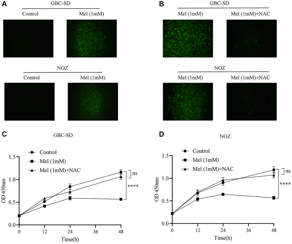 To investigate the anti-proliferation mechanisms of melatonin on gallbladder cancer cells, Annexin V and PI double staining apoptosis kit was used for detection of apoptosis in melatonin (1 mM) treated tumor cells for 48 h (Figure 3A). Melatonin significantly increased the early and late apoptotic ratio in NOZ and GBC-SD cells (Figure 3B). Western blot analysis revealed that 1 mM melatonin treatment markedly elevated the expression levels of apoptosis-associated proteins, including Bax, cleaved PARP, Cytochrome C, and cleaved caspase-3 in GBC-SD as well as NOZ cells (Figure 3C–3F). Besides, melatonin decreased the expression of anti-apoptosis related protein Bcl-2 in both GBC-SD cells and NOZ cells. ROS generation in cells was detected using the ROS assay kit. The ROS levels were increased following 1 mM melatonin treatment for 48 h (Figure 4A). After pre-treatment with 2 mM of the ROS scavenger, N-acetyl-L-cysteine (NAC) for 1 hour, the production of ROS was significantly inhibited in gallbladder cancer cells (Figure 4B). Furthermore, pre-treatment with NAC reversed the inhibitory effects of melatonin on GBC-SD (Figure 4C) as well as NOZ cells (Figure 4D). These results demonstrated that melatonin induced apoptosis by increasing ROS production in gallbladder cancer cells.