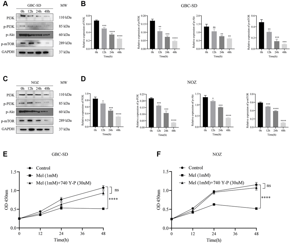 The PI3K/Akt/mTOR signaling pathway has been reported to participates in cancer cells proliferation and metastasis. Following 1 mM melatonin treatment at varying times (0, 12, 24, and 48 h), expressions of phosphorylated Akt, PI3K, and mTOR in GBC-SD cells were detected by western blot assay (Figure 5A). Phosphorylation levels of key proteins were time-dependently markedly inhibited (Figure 5B). In the NOZ cells treated with 1 mM melatonin, the phosphorylation levels of Akt, PI3K, and mTOR were also curbed (Figure 5C, 5D). Furthermore, co-treatment with melatonin and a cell-permeable PI3K activator 740 Y-P noticeably undermined the suppressive effects of melatonin on tumor cell proliferation (Figure 5E, 5F). These findings imply that melatonin initiated NOZ and GBC-SD cell apoptosis by suppressing PI3K/Akt/mTOR signaling pathway activation.